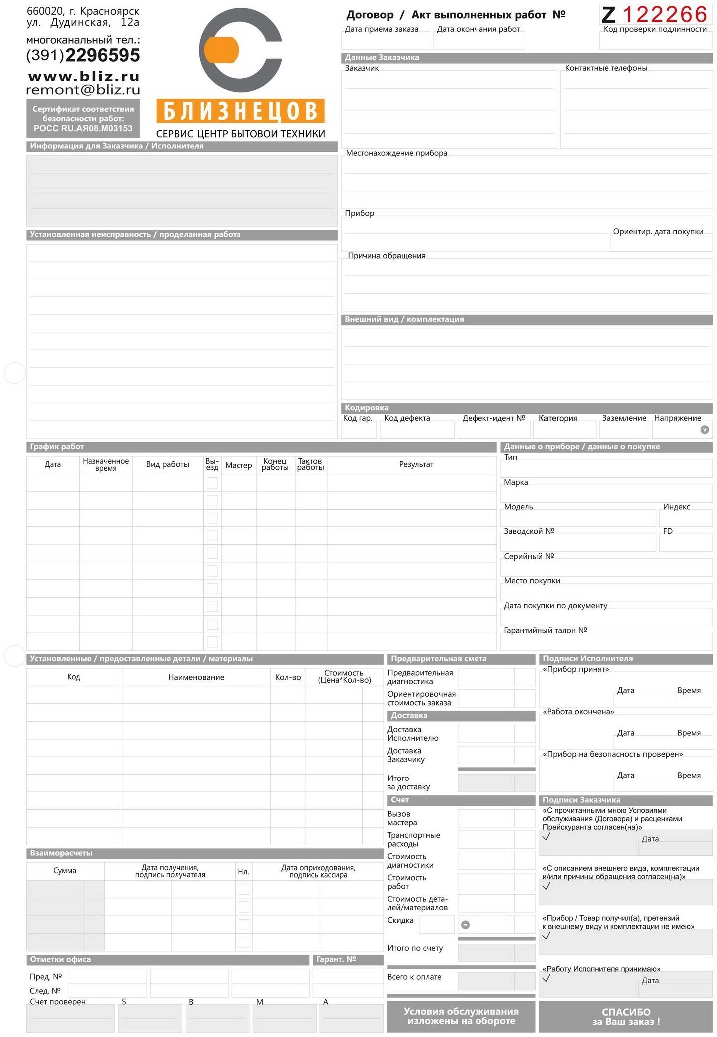 В обмен на устройство Вам будет выдан "Договор", он же "Акт выполненных работ". В нём указывается полный перечень проведённых работ и информация о запчастях для прибора (если таковые потребуются).